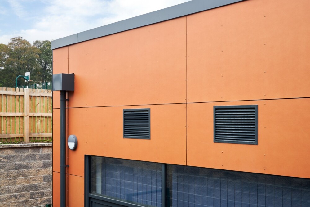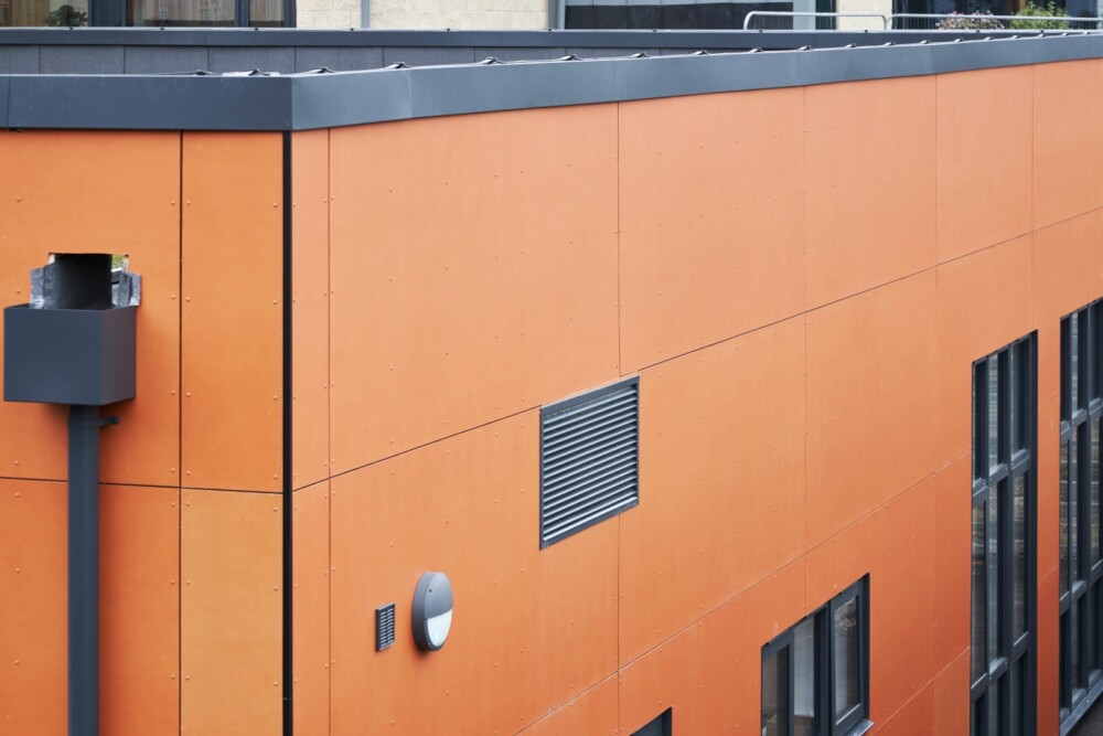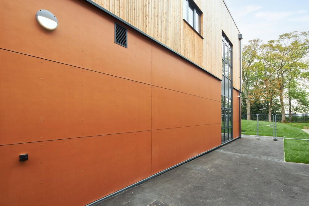 With its A2 fire rating and BBA certification, Hardie® Panel was particularly well-suited for an educational environment. In addition to its compliance credentials, the product offers long-term durability, low maintenance requirements, and low CO₂ emissions. To achieve the desired aesthetic, the panels were specified in a metallic copper finish, creating a striking contrast against the vertical timber cladding used on the first-floor elevation. Together, the facade materials give the building a warm and welcoming finish, providing a beautiful contrast to the masonry used on the adjacent building, and the green spaces surrounding the area.